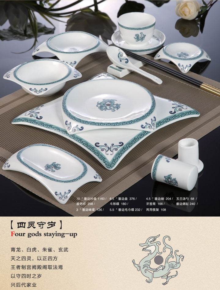 10寸垂边衬盘、6.5寸垂边盘、4.5寸垂边碗、玉兰汤勺、垂把杯、斗形碟、牙签筒、垂边烟缸、3寸垂边味碟、5.5寸垂边毛巾碟、两用筷架。